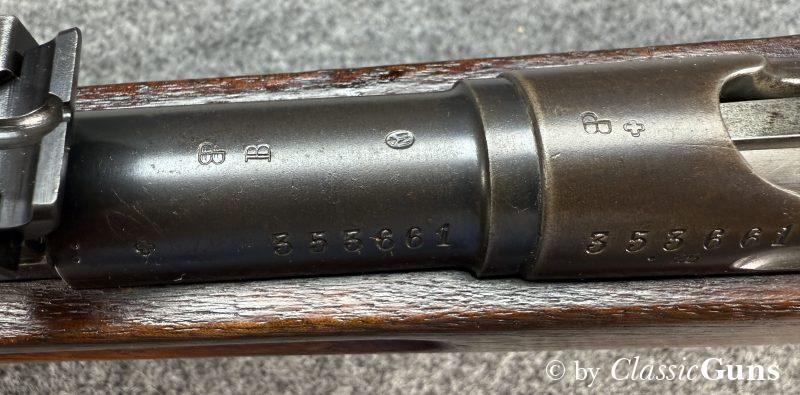 Lauf mit sehr gutem Zug-/ Feldprofil. Originale Brünierung zu etwa 85% erhalten und mit nur leichten Gebrauchsspuren und etwas Patina. Sehr gut erhaltener Nussbaumschaft mit den üblichen Gebrauchsspuren einer militärisch geführten Waffe. Komplett nummerngleich, Magazin ohne Nummer. Zum Lieferumfang gehört der originale Mündungsschutz.