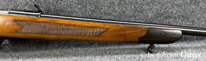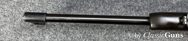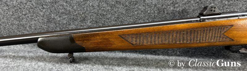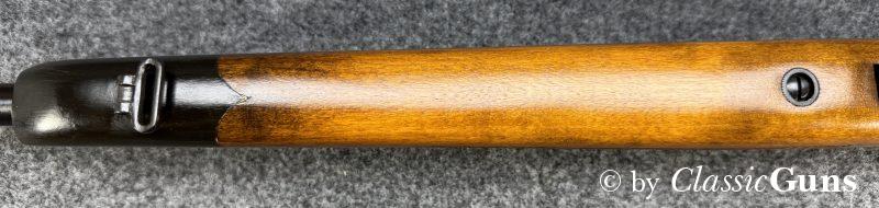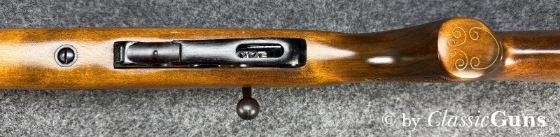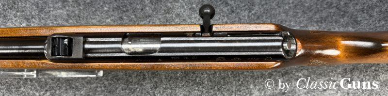490 mm langer Lauf mit neuwertigem Zug-/ Feldprofil. Sehr gut erhaltene Brünierung und sehr gut erhaltener Schaft aus lackiertem Hartholz. Einstellbarer Druckpunktabzug, Visier mit vier Höheneinstellungen, Prismenschiene und Stahl-Einsteckmagazin für fünf Patronen.
