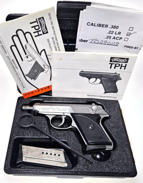 Original schwarze „Walther INTERARMS“ Hartschalenbox aus Kunststoff (S/N: T028608) mit: Originalersatzmagazin, Anschußscheibe, Bedienungsanleitung TPH, Walther TPH „Instruction And Safety Manual“ und Reinigungsstock aus Kunststoff.