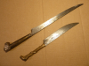 Das lange Messer mit der schmalen Klinge ist 33 cm lang und die Klinge 23,5 cm. Die Klinge ist graviert und hat Messingeinlagen. Ebenfalls der Griff. Guter, sehr scharfer Klingenstahl!