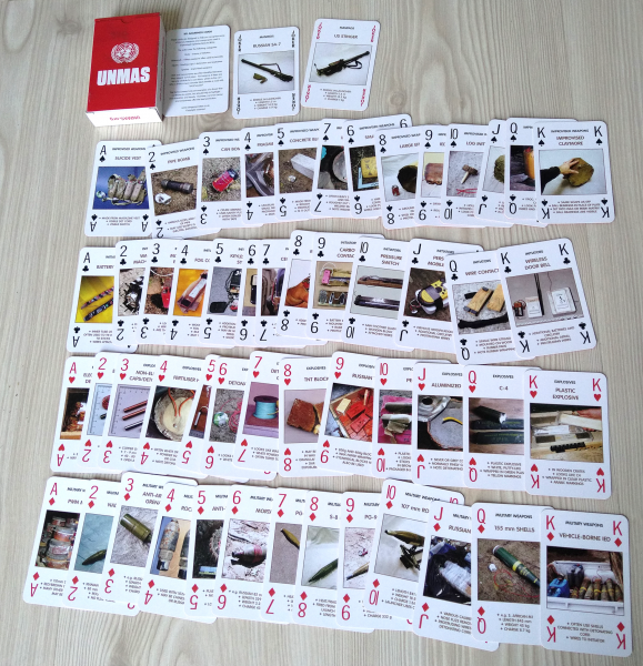 Spielkarten - Set IED / UXO der UNMAS mit Fokus auf Afghanistan, ca. 20 Jahre alt. Neuwertiger, unbespielter Zustand. Karton hat leichtere Lagerspuren.