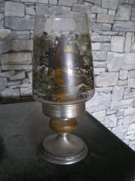 Verkaufe ein neuwertiges Windlicht mit Jagdmotiv un dZinnfuß, Höhe 18cm. Das Windlicht stand nur in der Vitrine.