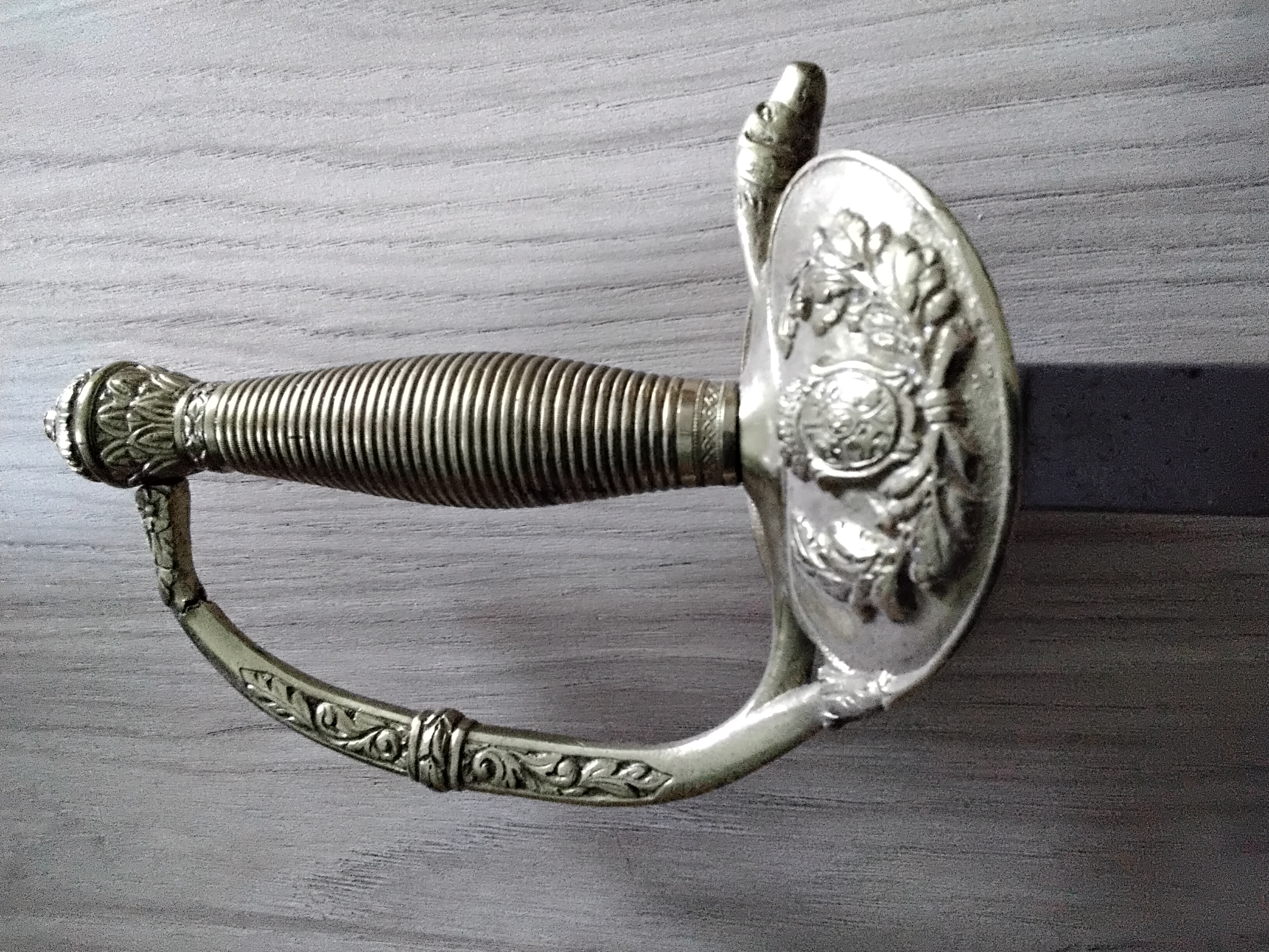 Messingdegen mit Spanischem Wappen am Ende Hundekopf.Gesamtlánge 88 cm, Klinge 74 cm, Breite 20cm. Sammelwuerdiger Zustand.