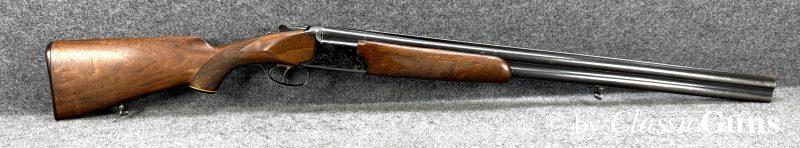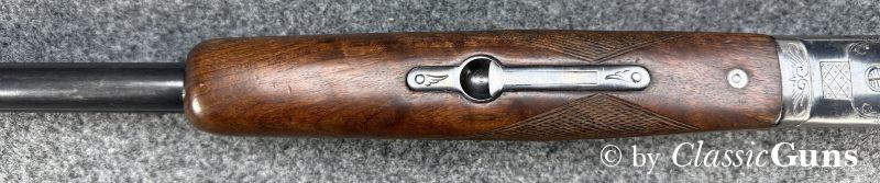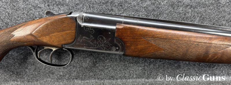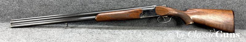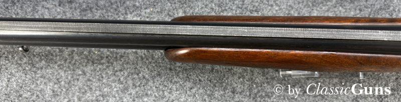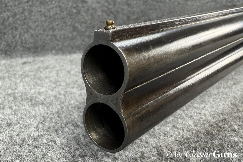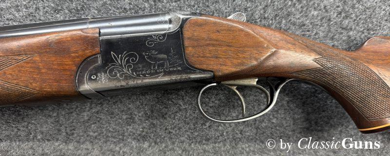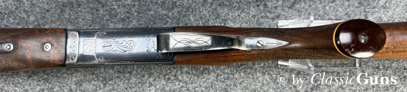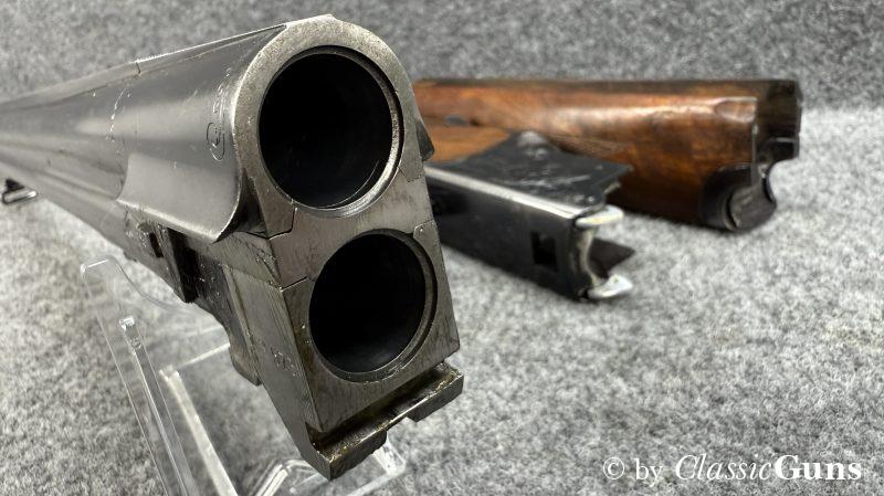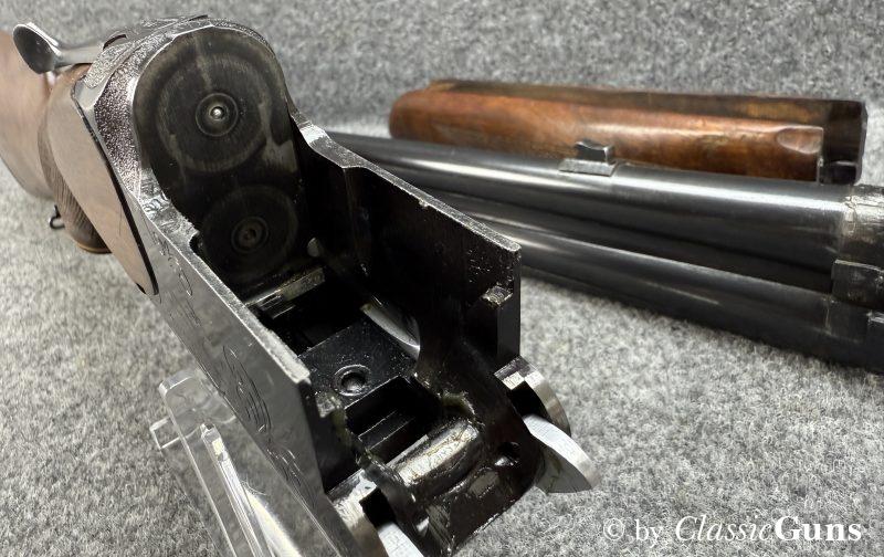 Die offensichtlich gerne geführte Flinte weist äußerlich stärkere Gebrauchsspuren auf, technisch ist sie absolut einwandfrei und der Verschluss ist dicht. Das Laufbündel ist 730 mm lang, beide Läufe sind innen blank und rostfrei, oben ¾ und unten ½ Choke. Doppelabzug, manuelle Schiebesicherung, automatischer Auszieher.