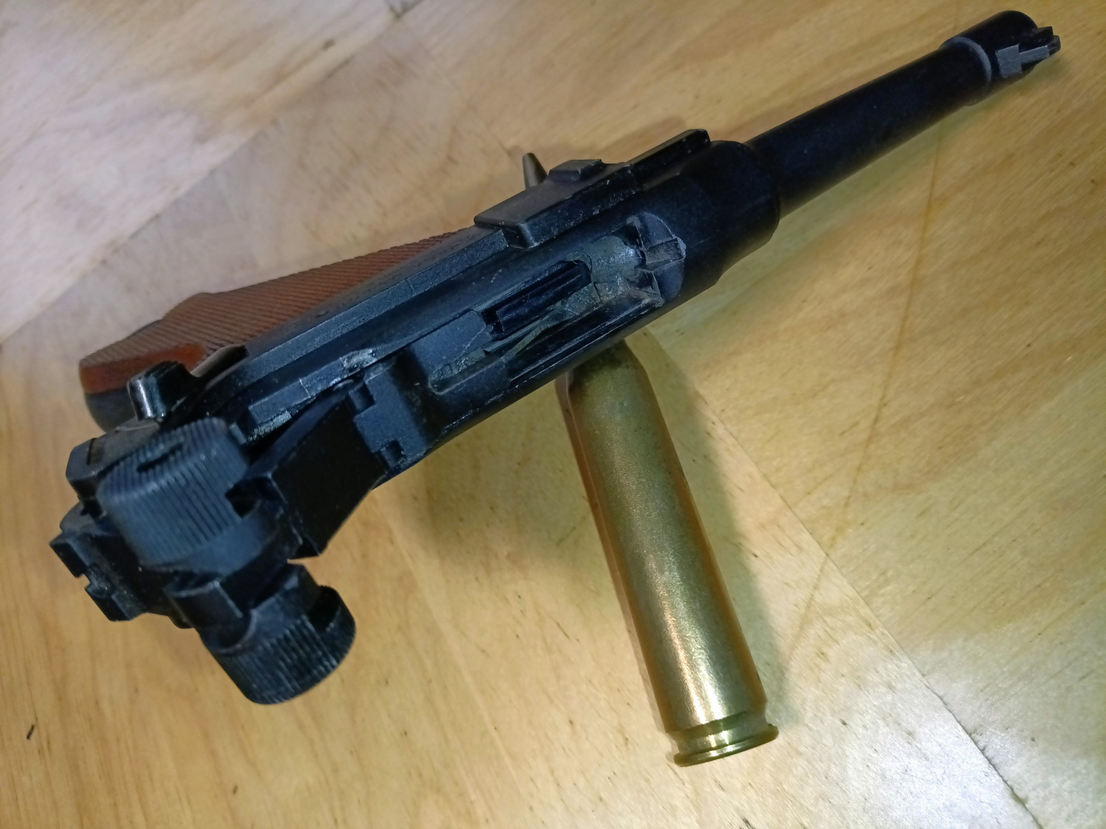 Hochwertige, aber wie bei der Originalwaffe anfällige Selbstladetechnik mit Kniegelenkverschluss.