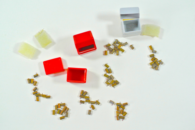 Angeboten werden 73 Stück (natürlich unbenutzte) 2mm-Stift-Patronen – verteilt auf 3 Original-Xythos-Kästchen (z.B. für Berloque oder Xythos-Mini-Waffen)