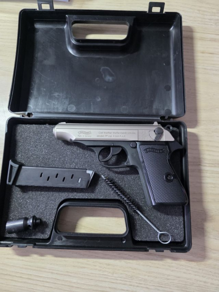 Walther PP. Gas-Signal Pistole. Kaliber: 9 mm P.A.K. 7-Schuss-Magazin. Konnte die Waffe nicht mit Munition testen, daher Verkauf erfolgt unter Ausschluss jeglicher Sachmängelhaftung.