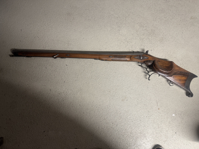 Standstutzer, österreichisch, Perkussionszündung, Kal. 10mm LL 840mm, TL 1190mm, Achtkantlauf,Rückschloss mit flacher Schlossplatte. Nadelstecher, Nadel abgebrochen. Nussholzvollschäftung mit Tirolerbacke, beschnitzt, Vorderschaftabschluss aus Horn. Lauf mit Kreuzschraube und drei Stiften im Vorderschaft befestigt. Eiserne Garnitur und Ladestock mit Messingdöpper SPERRGUT!! Versand Deuschland 45 Euro