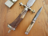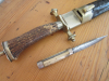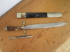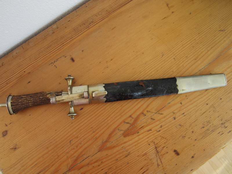 Alter Hirschfänger mit Lederscheide und Beimesser mit Gebrauchsspuren. Auf der Klinge steht, Wünsche Leipzig. Die Parierstange wackelt minimal, die Klinge hat wohl altersbedingte Flecken. Der Griff besteht aus Horn. Das Beimesser dürfte in Handarbeit entstanden sein, ebenfalls mit Horngriff. Rostnarben an der Klinge. Der Hirschfänger geht passend in die Scheide, das Beimesser dürfte nachträglich ersetzt worden sein, passt aber sehr gut dazu. Die Lederscheide zeigt natürlich altersbedingte Flecken und stellenweise abplatzer vom Leder. Jedenfalls ein dekoratives Stück aus seiner Geschichte. Gesamtlänge 48 cm, das Beimesser 17 cm. Bei Versand in benachbarte Länder, erhöhen sich die Versandkosten. Da Privatverkauf keine Garantie oder Umtausch.