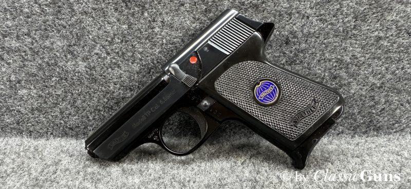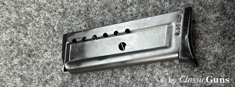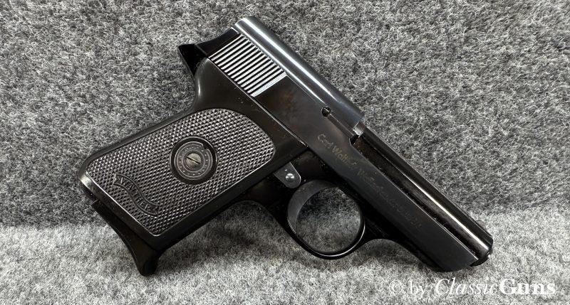 Bewährte und annähernd neuwertig erhaltene 6,35er Taschenpistole, in unserer Büchsenmacherwerkstatt fachmännisch gereinigt und verantwortungsbewusst geprüft.