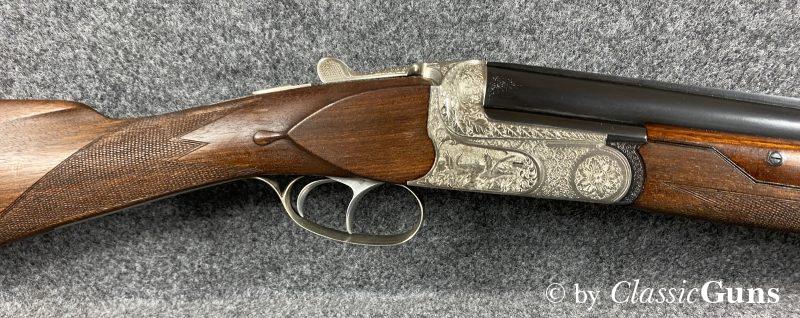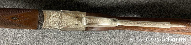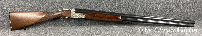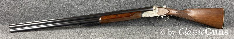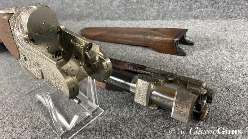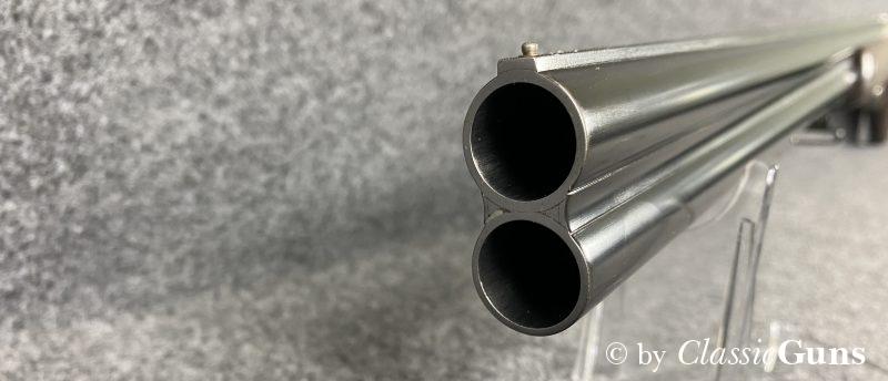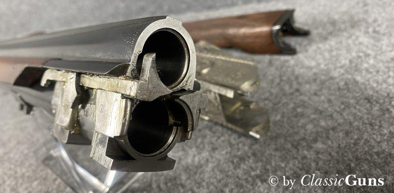750 mm langes Laufbündel, beide Läufe innen blank, oben Vollchoke, unten Halbchoke, 8 mm Visierschiene und Perlkorn aus Stahl. Sehr gut erhaltene Brünierung. Sehr gut erhaltener Englischer Schaft aus ölgeschliffenem Nussbaum und mit handgeschnittener Fischhaut. Ansprechend gravierte Stahlbasküle mit dichtem Verschluss, Doppelabzug, automatische Sicherung und kräftige Ejektoren.