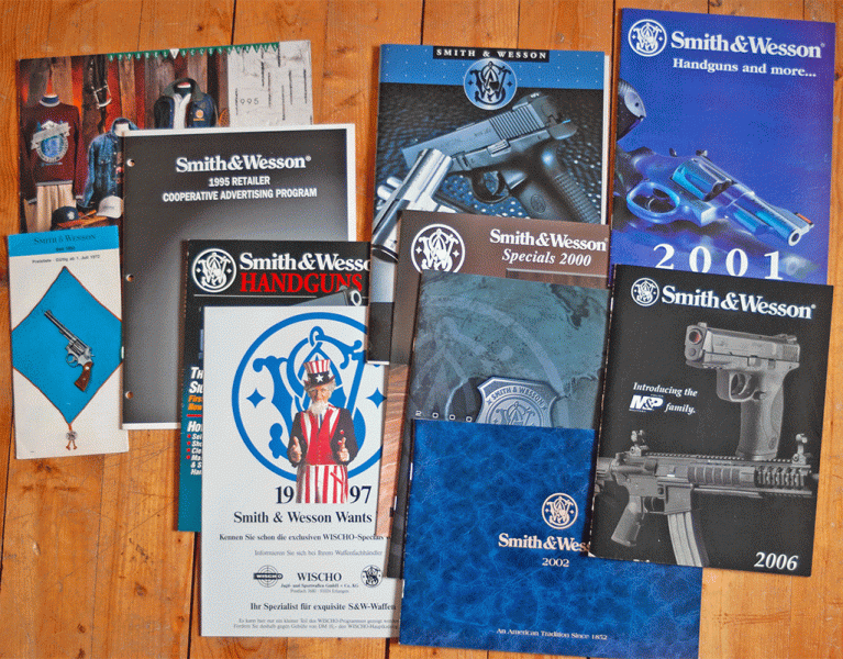 Grosses Konvolut Werbebroschüren der Firma Smith& Wesson, 11 verschiedene Prospekte, z.B.: von 1972, 1995,1997, 2000, 2001, 2002, 2006,