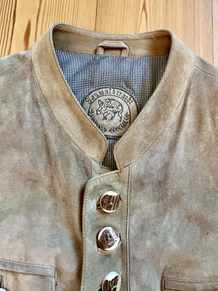 Hirschledersakko mit Hirschhornknöpfen, Farbe hellbraun, Karrofutter mit Innentaschen, Grösse XL, Marke Sauwaldtracht, weiches, hochwertiges Leder mit Patina..