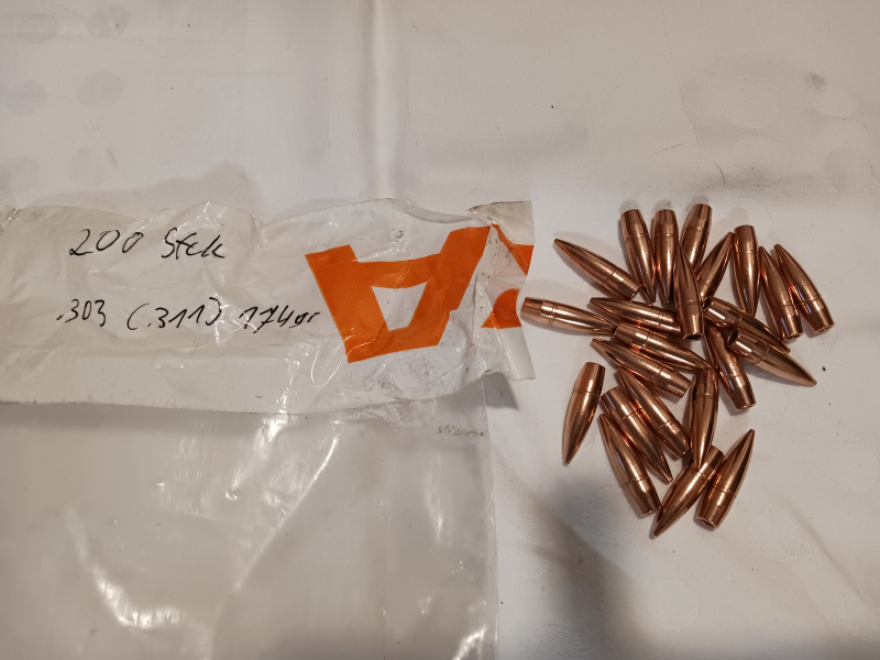 Verkaufe 200 Stück Geschosse für .303 Britisch, Hersteller unbekannt. Die Geschosse haben ein Gewicht von 174 grain und einen Durchmesser von .311.