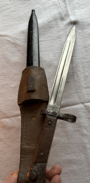 14.Inf.Regiment aus Linz , Parierstange mit Laufführungsring, Stahlknauf mit Drücker, der Drücker ist gängig, 2-fach vernietete Holzgriffschalen, auf der Klinge beidseitig eine lange Hohlkehlung, auf der Scheide ist noch zusätzliche ein Herstellerkennung Vogel&Noot , an dem Koppelschuh sind alle Nähte intakt und fest, Gesamtlänge ca. 37,5 cm,