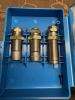 Dillon Hartmetall-Matrizensatz enthält eine Hartmetall-Kalibrier-/Entzünder-Matrize, eine Geschosssetz-Matrize und eine Crimp-Matrize.