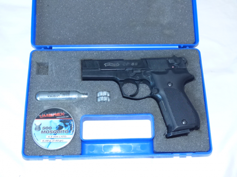 Verkaufe meine Walther CP 88 CO2 Pistole. Kaliber 4,5 mm Diabolo. Der Antrieb erfolgt mit einer 12 g CO2 Kapsel. Es kommen die 8 schüssigen Trommelmagazine zum Einsatz, die auch für eine Reihe anderer Waffen verwendbar sind. Zustand: es funktioniert alles einwandfrei wie es soll. Auf der linken Seite ist die Glanzbrünierung im vorderen Bereich etwas fleckig (was nur unter einem bestimmten Betrachtungungswinkel auffällt - siehe Fotos 4 und 5). Möglicherweise wurde vom Vorbesitzer ein zu scharfes Reinigungsmittel verwendet. Geliefert wird was auf den Fotos zu sehen ist: die CP 88 mit Original Koffer, eine CO2 Kapsel, 2 Trommelmagazine und eine volle Dose Diabolos. Bei Bedarf können weitere Trommelmagazine und auch CO2 Kapseln mit dazu erworben werden. Die Waffe trägt ein "F im Fünfeck" und ist frei verkäuflich ab 18 Jahren. Ein Alternachweis ist erforderlich. Versand als DHL-Paket oder Barzahlung bei Abholung (Nähe 87600 Kaufbeuren).