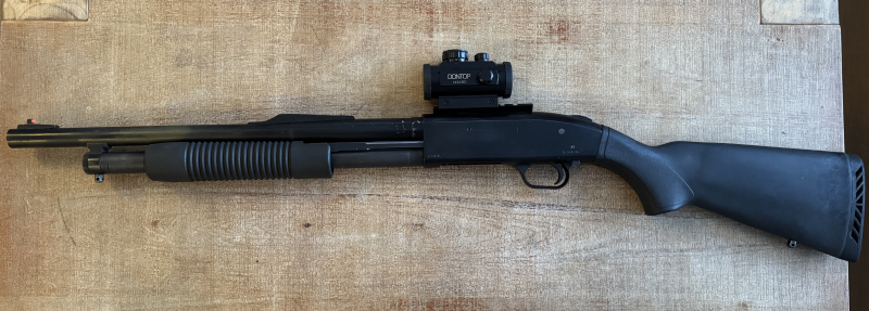 Zum Verkauf steht eine Mossberg 500a im Kaliber 12/76 mit Wechsellauf (Lauflängen 50cm und 70cm), Rotpunkt und Wechselchokes. Die Waffe verfügt über einen Kunststoffschaft.
