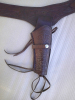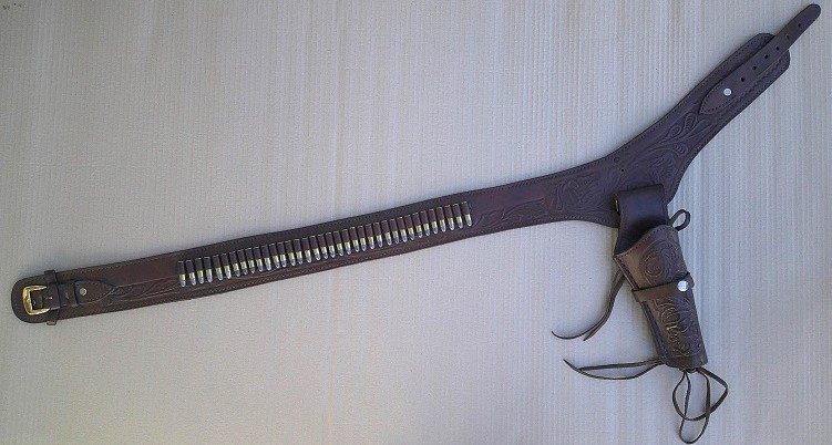 Sehr schöner Revolvergurt, braunes Dickleder, mit floralen Motiven punziert. Der 7,5 cm breite und von 120 bis 125 cm Länge verstellbare Gurt hat 36 Patronenschlaufen. Mit den Dekopatronen cal. 38 spezial (ohne Pulver und mit abgeschlagenen Zündhütchen) und den leichten Gebrauchsspuren ist er ideal für Reenactment. Die Dekopatronen sind nicht angebohrt! Das ebenfalls punzierte Holster ist rechts am Gurt befestigt und für Revolver von 5 1/4 bis 7 ½ Zoll Lauflänge geeignet (siehe Fotos).
