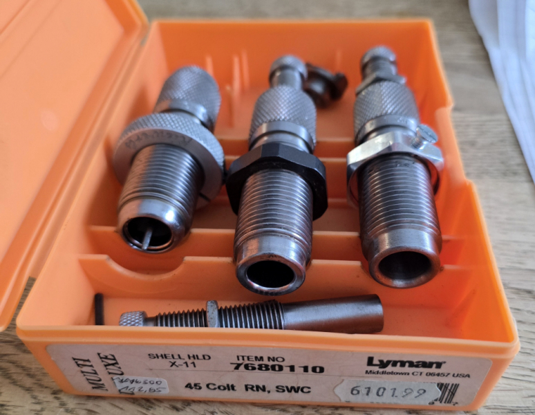 Moin. Ich verkaufe hier im Auftrag einen gebrauchten Lyman Matrizensatz Kal. .45 Long Colt mit Hartmetall-Kalibriermatrize. Ich habe den MaSa auseinader genommen und gereinigt. Hülsenhalter inklusive. Die Kontermuttern sind nicht original...