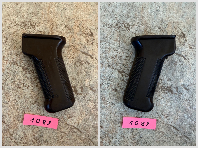 Der Griff war im NVA-Einsatz, mit deutlichen Gebrauchsspuren, aber ohne Risse und stammt aus DDR Produktion, siehe Foto. Durch eine Reinigung lässt der Zustand noch deutlich verbessern.