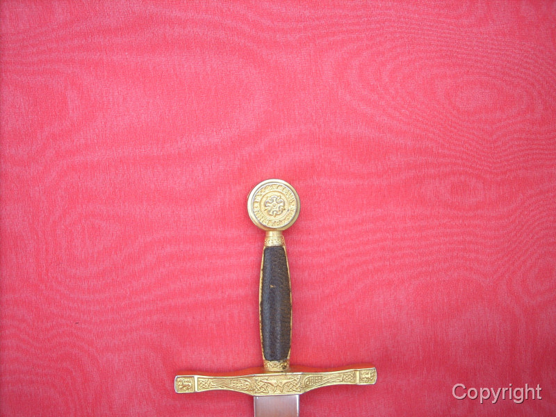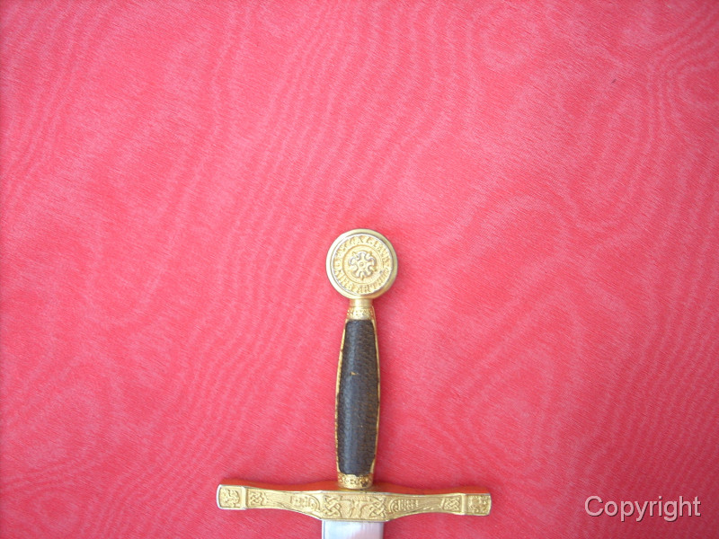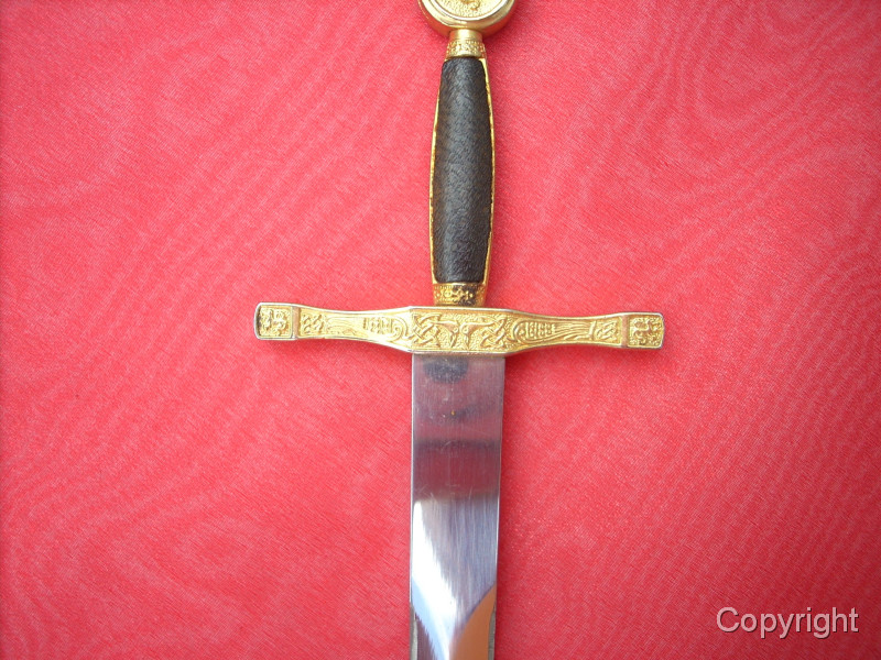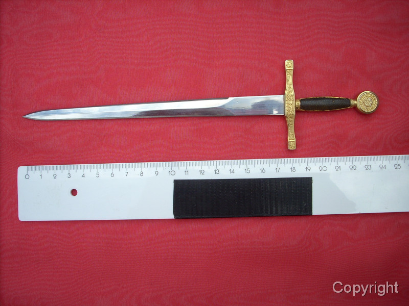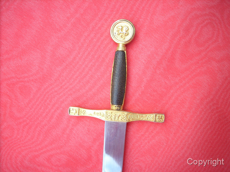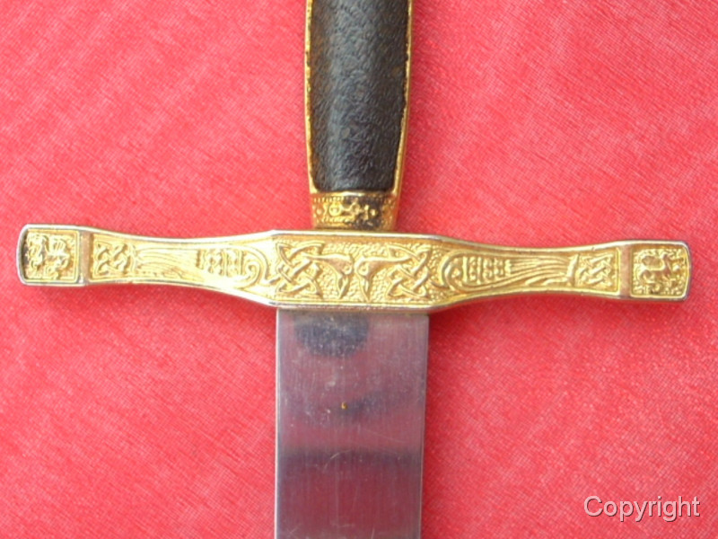 Wunderschönes, Miniaturschwert EXCALIBUR von König Arthur. Sehr aufwendige Arbeit. Griffstück beidseitig Leder, Stahlklinge, Parierstange ond Kopfschraube goldfarben und reich verziert. In der Kopfschraube auf der einen Seite der englische Drache, auf der anderen Seite Symbol bir Umschrift: EXCALIBUR KING ARTHUR. Ein tolles Sammlerstück, das sich sogar zerlegen läßt. Bitte alle Fotos betrachten, es lohnt sich ! Top Zustand, siehe Fotos, die Bestandteil der Artikelbeschreibung sind. Keine Garantie und keine Rücknahme.