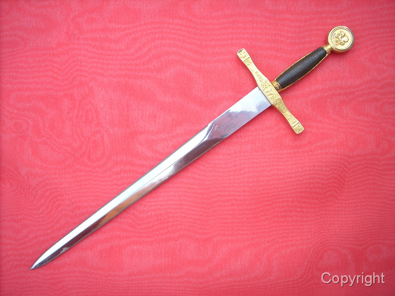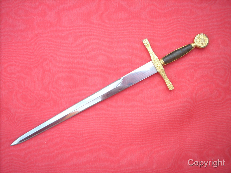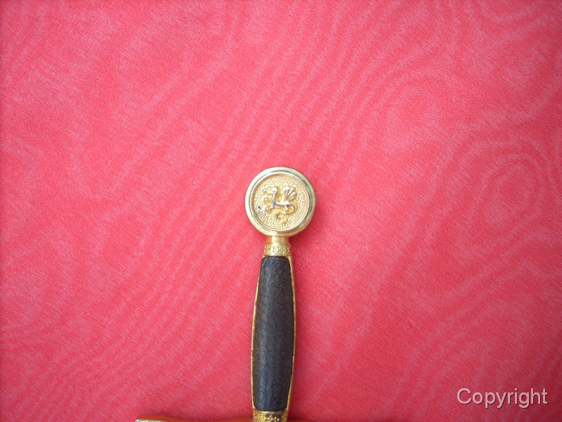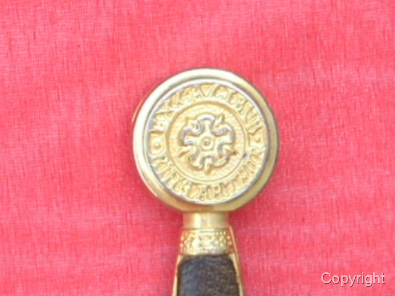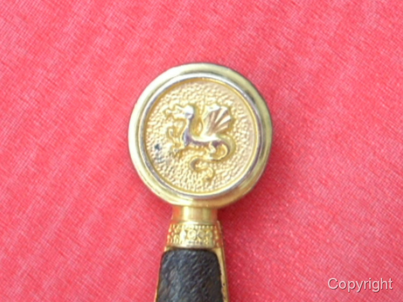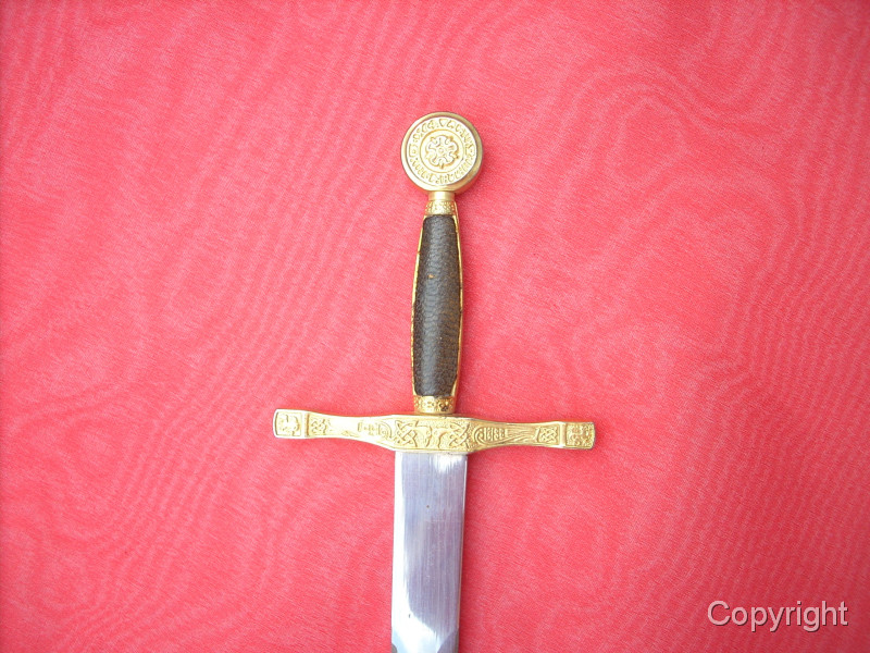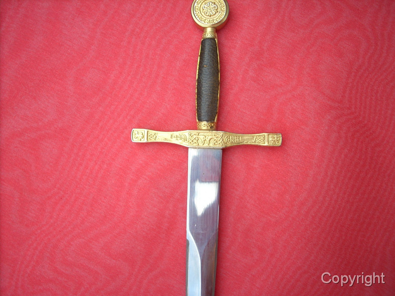 Wunderschönes, Miniaturschwert EXCALIBUR von König Arthur. Sehr aufwendige Arbeit. Griffstück beidseitig Leder, Stahlklinge, Parierstange ond Kopfschraube goldfarben und reich verziert. In der Kopfschraube auf der einen Seite der englische Drache, auf der anderen Seite Symbol bir Umschrift: EXCALIBUR KING ARTHUR. Ein tolles Sammlerstück, das sich sogar zerlegen läßt. Bitte alle Fotos betrachten, es lohnt sich ! Top Zustand, siehe Fotos, die Bestandteil der Artikelbeschreibung sind. Keine Garantie und keine Rücknahme.
