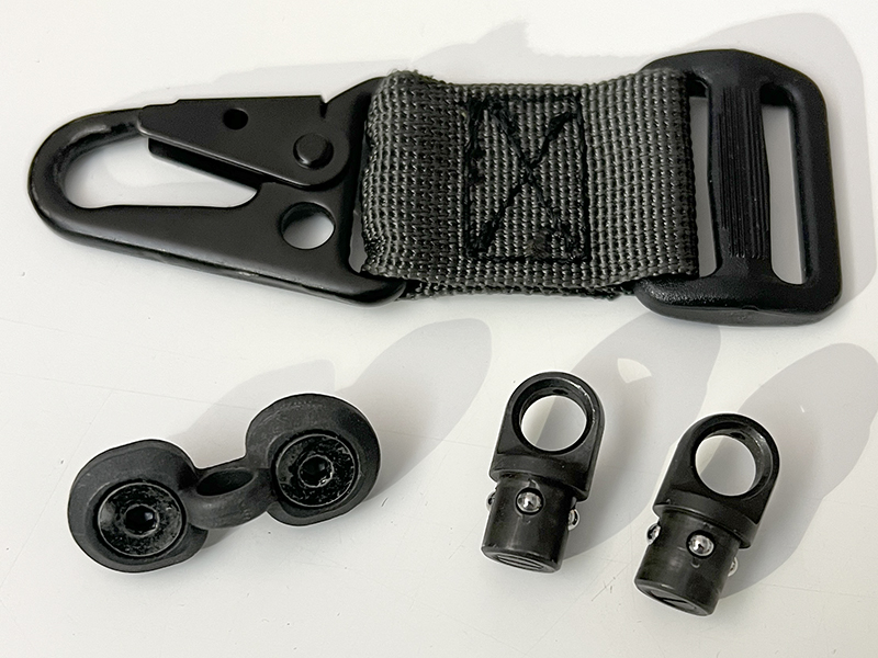 2 Stk. Eratec Kugeldruck-Adapter für HK-Karabiner (Neupreis 38,90 pro Stk.) 1 Stk. M-Lok Riemenbügelöse für Karabinerhaken (Neupreis 15,90) 1 Stk. HK Karabiner (Neupreis 17,90)