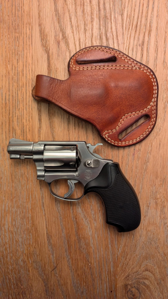 On Top gibt es ein passgenaues, braunes Lederholster der Premium-Marke Bianchi (Modell "Shadow" #8 S&W Chief) dazu. Das Holster ist gebraucht, aber in einem stabilen Zustand und perfekt für das verdeckte Tragen am Gürtel geeignet.