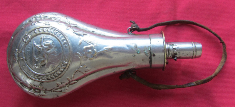Biete hier diese antike Pulverflasche – reichlich verziert – zum Kauf an. Die Metallflasche ist schön gearbeitet und in einem guten, zeitgemäßen Zustand würde ich sagen. Eine Seite hat wenig Gebrauchsspuren, eine Seite etwas mehr Abnutzungserscheinungen. Der obere Teil lässt sich mittels Gewinde abschrauben. Dieser Teil hat verschiedene Raster und Einstellungsmöglichkeiten, von „2 1/4 bis 3“. Zusätzlich gepunzt mit „DRM“. Habe die Flasche nur oberflächlich gereinigt und etwas geölt/gefettet. Die Flasche ist mittels Ösen an einen alten Lederriemen befestigt. Höhe, mittig gemessen, ca. 18,8 cm. Umfang Höhe Löwe ca. 19 cm. Einzelheiten siehe Bilder, sie sind wesentlicher Bestandteil der Beschreibung.Privatverkauf.