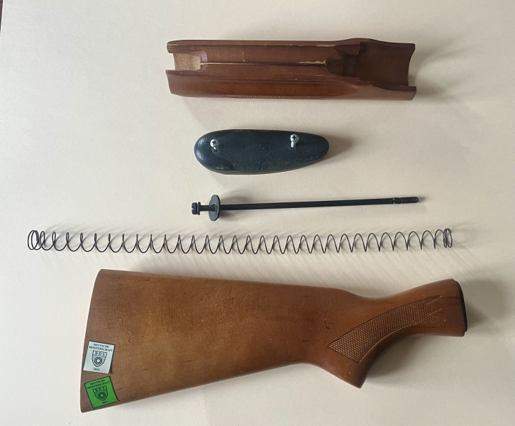 Es besteht aus: Hinterschaft mit Schaftkappe, Vorderschaft, Magazinfeder und Befestigungsschraube für den Hinterschaft.