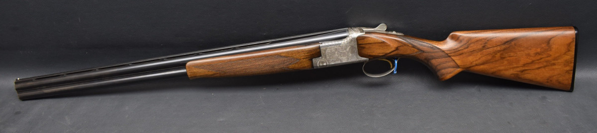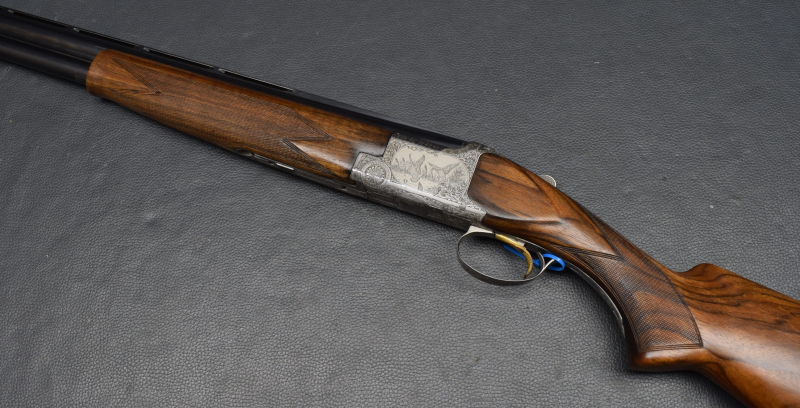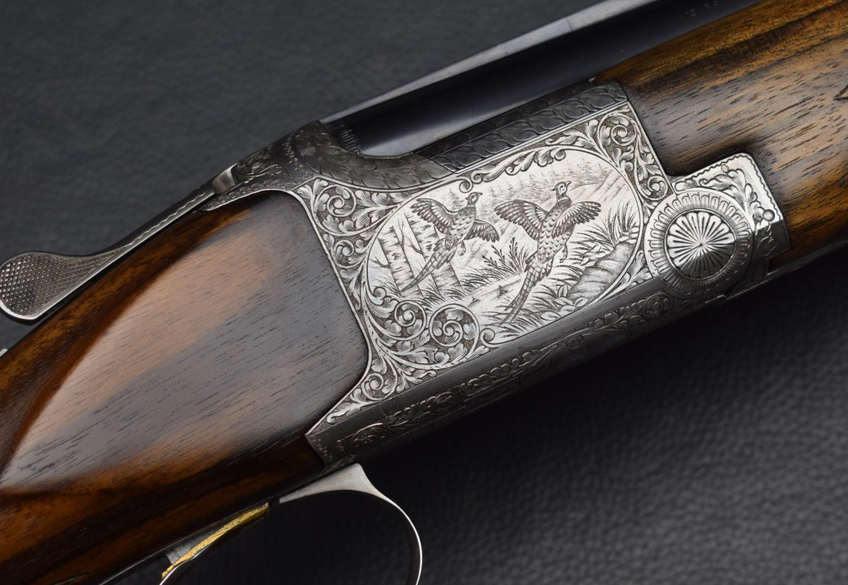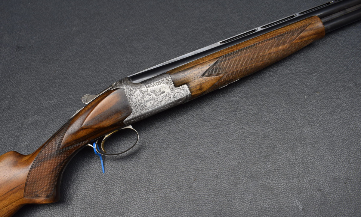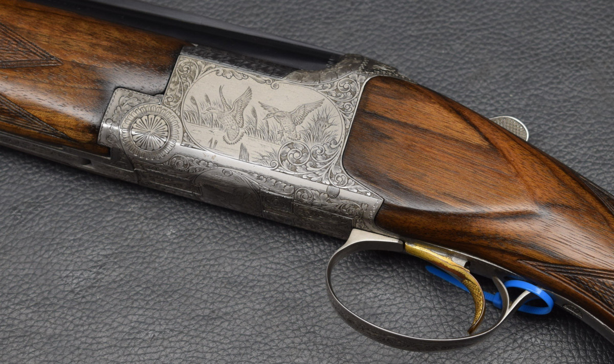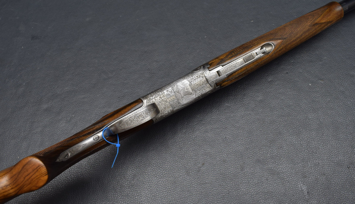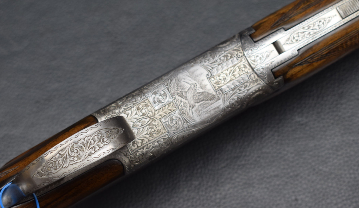 12 mm breite ventilierter Schiene, weißes Perlkorn, Ejektoren, Einabzug, heller Stahlsytemkasten mit Flugwildgravuren, Sicherungsschieber/Umschalter auf dem Kolbenhals,