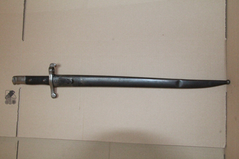 Bajonett M1885 Steyr,Klinge ohne Kerben,Griffschalen mit Kerben,Drücker ok,Scheide gut im unteren Bereich beidseitig mit leichten Dellen.