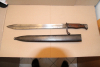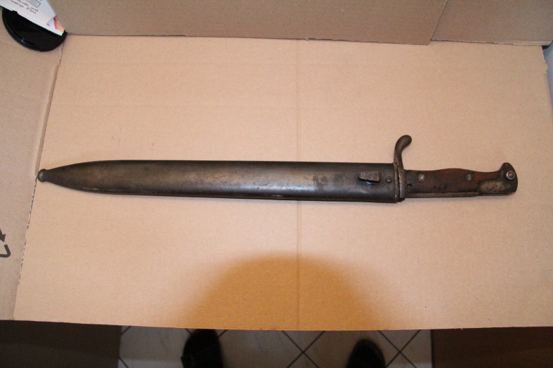 Bajonett 98/05 L18,Fichtel+Sachs Schweinfurt,Klinge mit Patina ohne Kerben,Parierstange Drückerseitig leicht Porig,Knauf mit Patina,griffschalen gut mit Abrieb, drückerseitig kleiner Riss an der unteren Schraube,Scheide gut mit Patina ohne Dellen stellenweise leicht porig,Koppelhaken porig.
