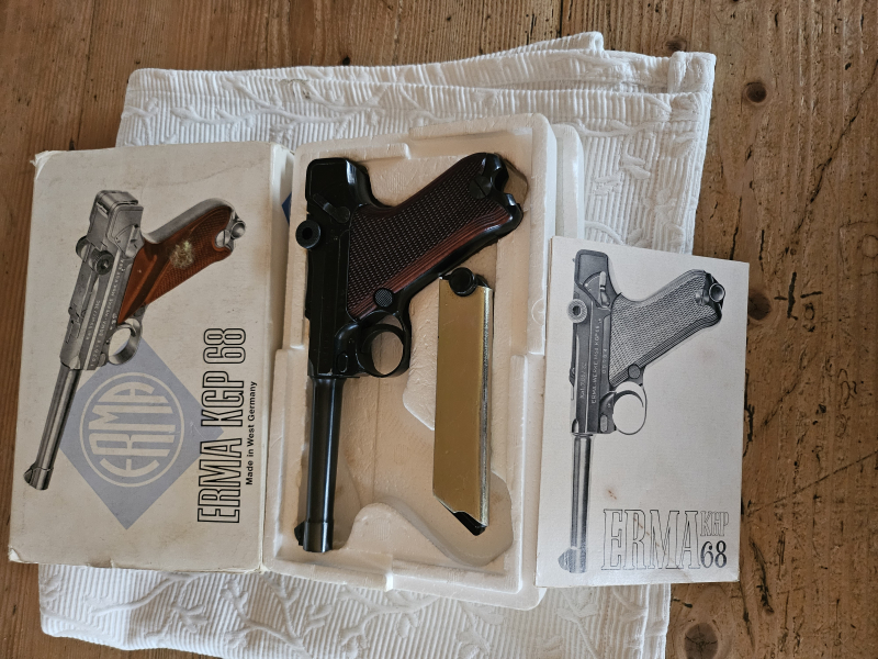 Die Waffe wird im originalen Verkaufskarton mit der originalen Bedienungsanleitung verkauft. Keinerlei Kratzer, wie neu im tiefschwarzen Werksbrünierungszustand. Made in Germany, ERMA-Werke, Dachau.