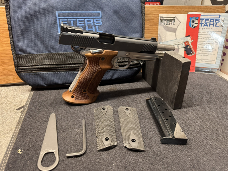 Ich biete hier meine Peters Stahl 1911 im Kaliber 9mm, Lauf 5 Zoll und Original Tasche mit Werkzeug und Anleitungen sowie der originalen Griffstücke, zum Verkauf an. Die Waffe befindet sich in einem einwandfreien Zustand und wird mit 2 Magazinen verkauft.