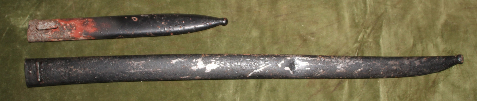 Zwei Bajonettscheiden für Bastler. 1 x für deutsches Bajonett M 84/98 III, K989k, 2. WK, stark rostig, narbig, stellenweise kleine Rostlöcher. 1x für französisches Bajonett Mle 1866 zum Chassepot-Gewehr oder ähnliche wie z.B. Remington Gewehre. Mit einer Delle, stellenweise etwas narbig. Bajonett lässt sich nicht ganz einstecken, Es muss irgend etwas in der Scheide stecken was entfernt werden müsste. Beide Stücke werden ausdrücklich als Schrott / Bastelstücke angeboten.