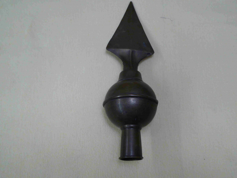 Fahnenmast Spitze aus zusammengelötetem Messingblech ( Antik ?? )------Für Mastdurchmesser ca. 30 mm------Länge ca. 310 mm----- Kugeldurchmesser ca. 80 mm-------leicht verbogen, Gebrauchsspuren vorhanden -----