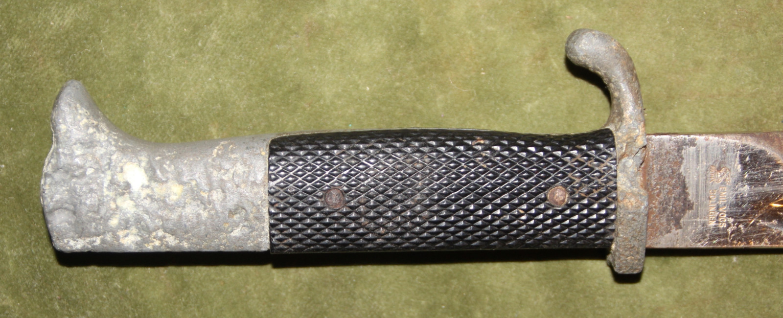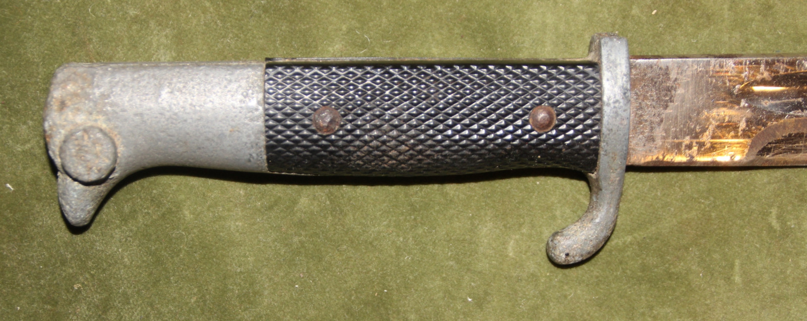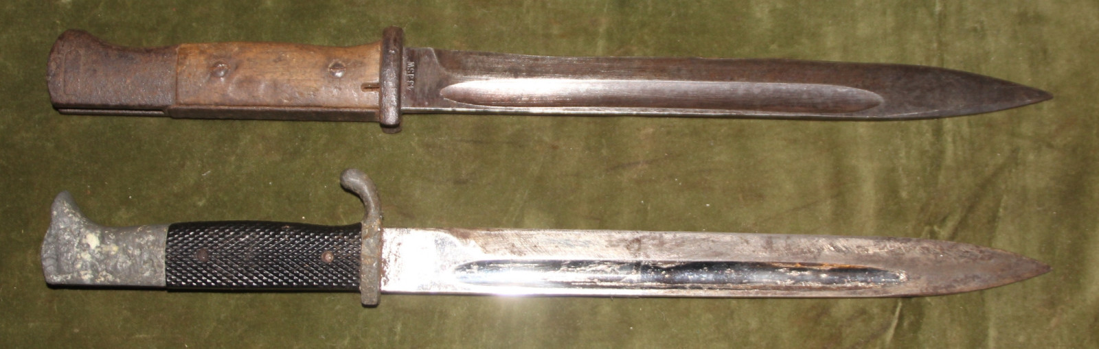 Zwei Bajonette für Bastler oder Bodenfundsammler. 1 x deutsches Bajonett M 84/98 III mit Holzgriffschalen, zum K989k, 2. WK, teilweise rostig und narbig, die Holzgriffschalen mit starken Alters- und Gebrauchspuren, beschädigt, ohne Scheide. 1x deutsches Extra-Seitengewehr KS 98, 3. Reich ohne Scheide, Klinge beschliffen, die Griffelemente mit starkem Zinkfraß, die Griffschalen intakt und schön. Beide Stücke werden ausdrücklich als Schrott / Bastelstücke angeboten.