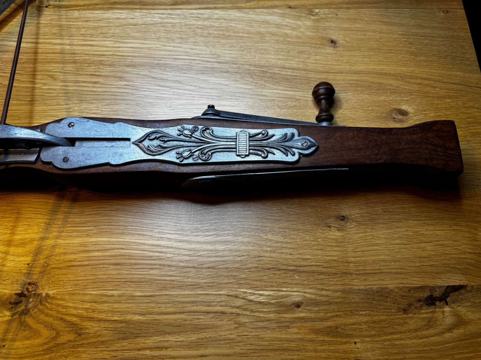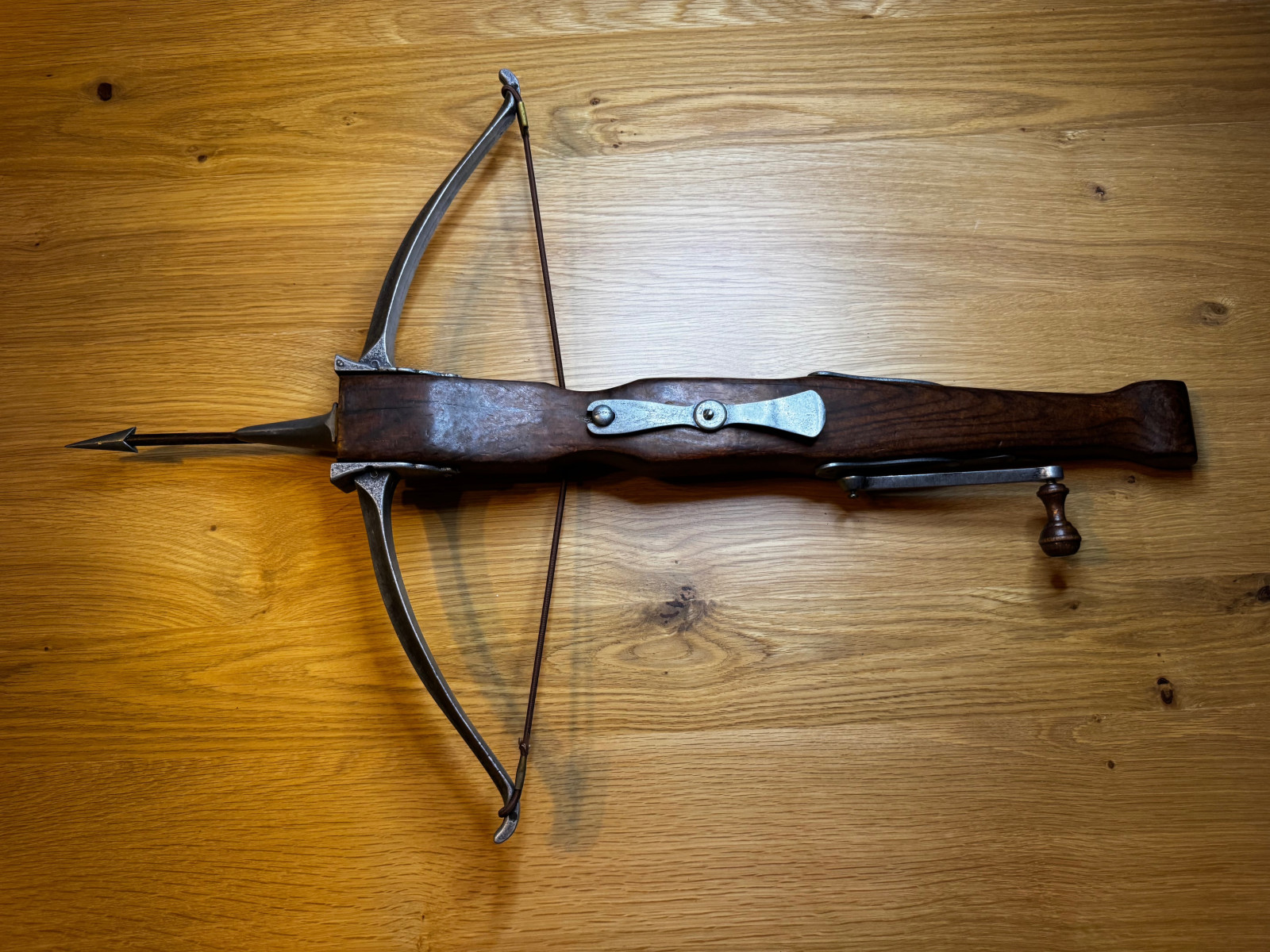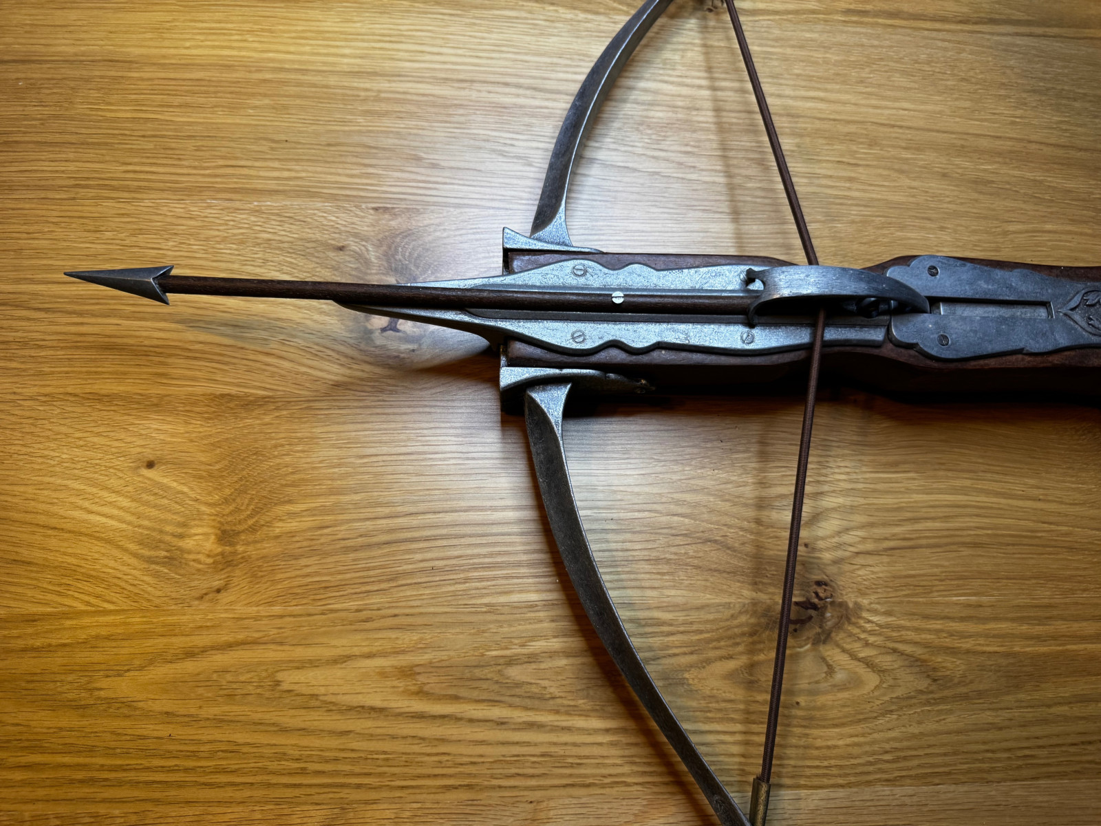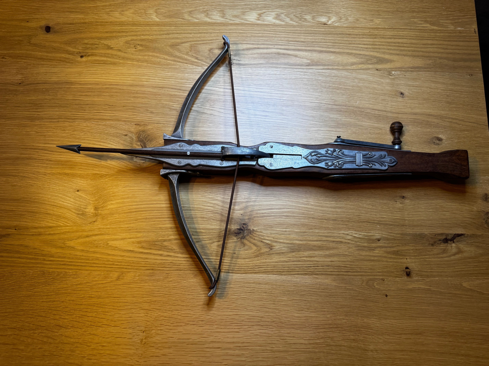 Es handelt sich um eine dekorative Replik mit funktionalem Spannmechanismus, gefertigt aus Holz und Metall, inklusive passendem Bolzen.