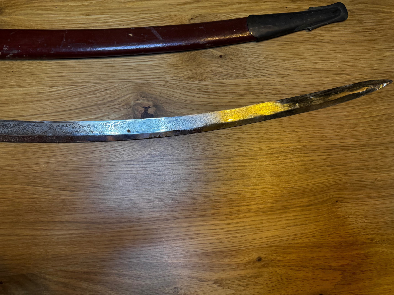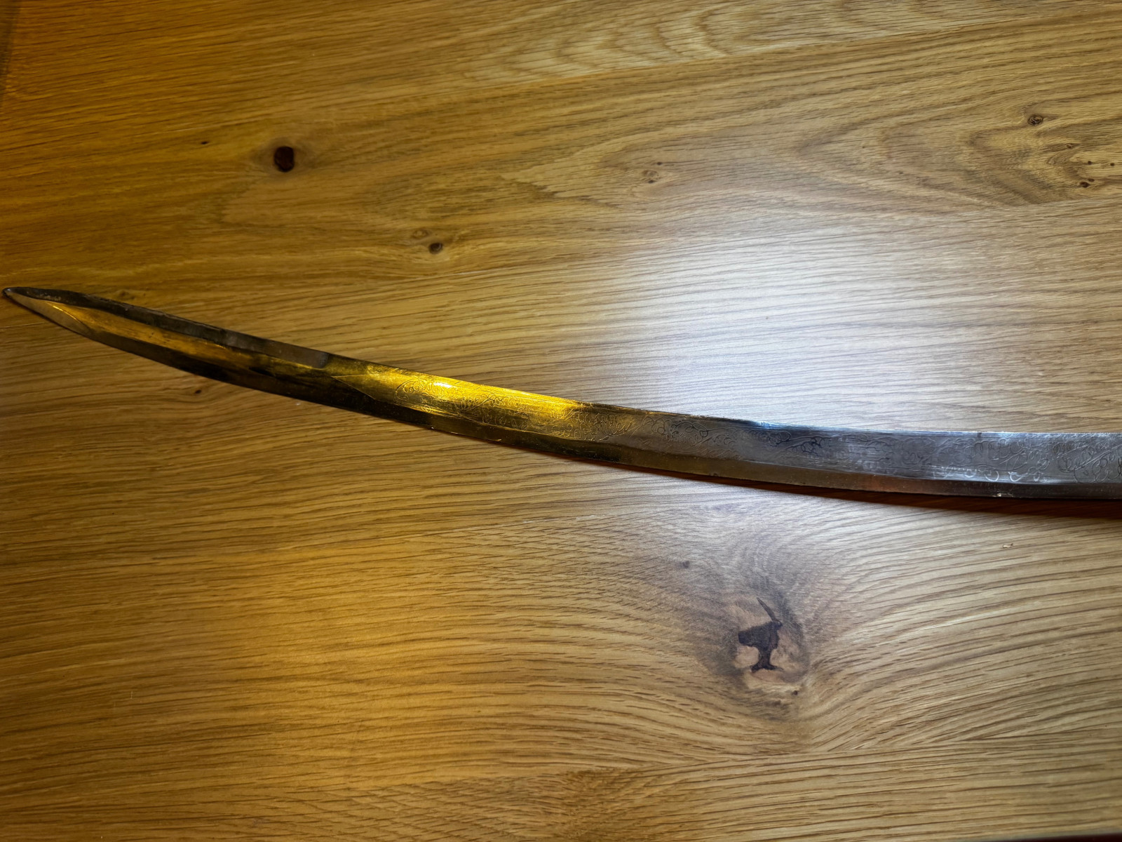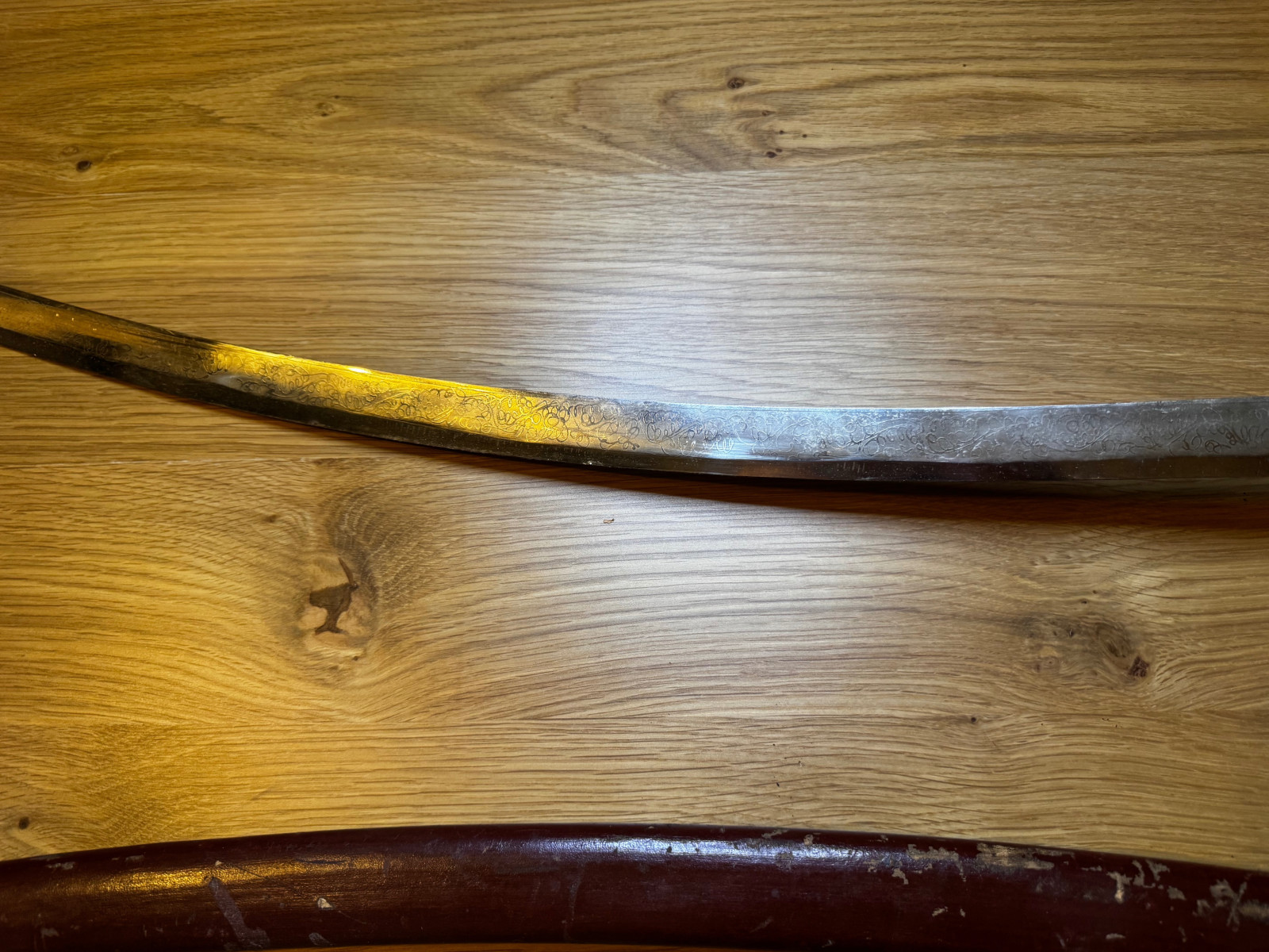 Der Säbel ist alt, mit deutlichen Gebrauchs- und Altersspuren.