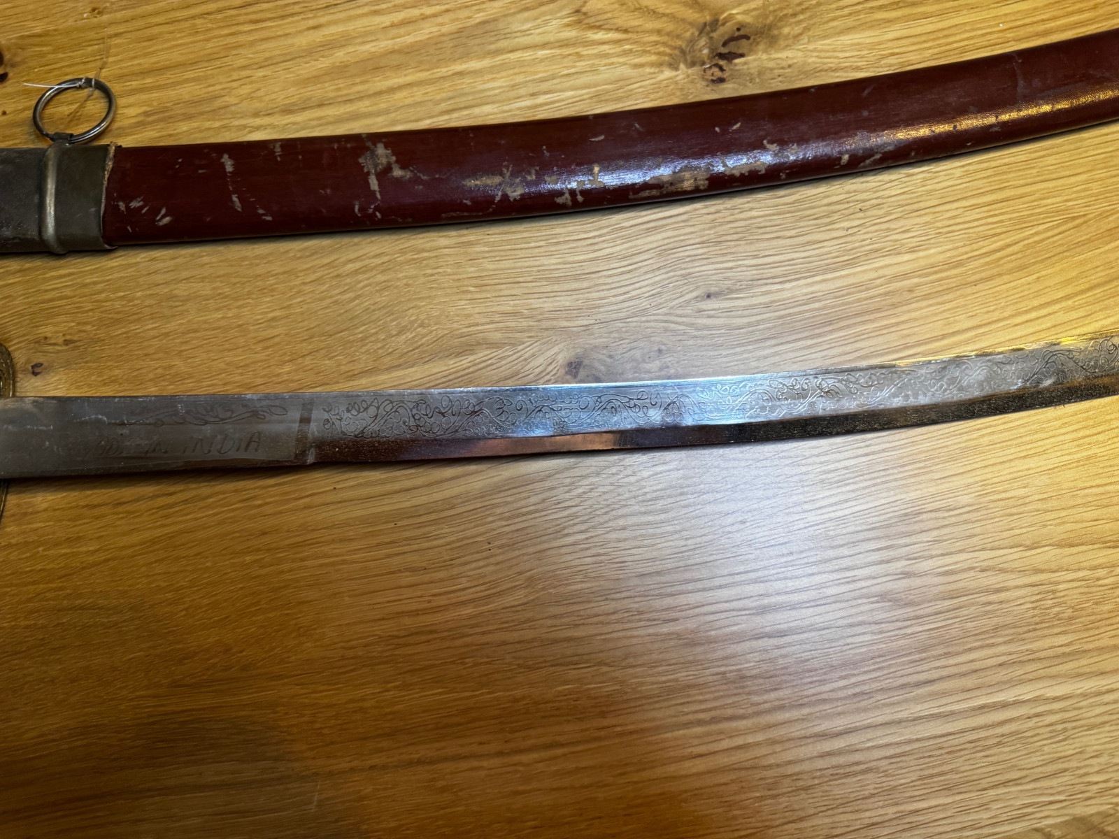 Klinge gebogen, mit Verzierungen, Messinggriff und passender Scheide (siehe Fotos).
