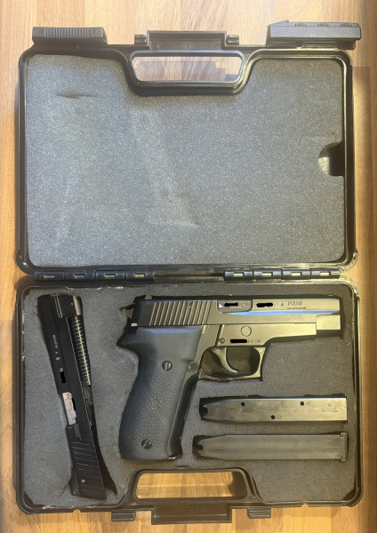 Ich verkaufe eine SIG Sauer P226 im Kaliber 9 Para aus ehemaligem Behördenbestand, die offiziell außer Dienst gestellt wurde und entsprechend mit einem großen „A“ nach der Seriennummer gekennzeichnet ist. Die Waffe wird als komplettes Set angeboten und verfügt zusätzlich über ein seriennummerngleiches Wechselsystem im Kaliber .22 l.r., was diese Kombination zu einer besonderen und seltenen Ausführung macht.