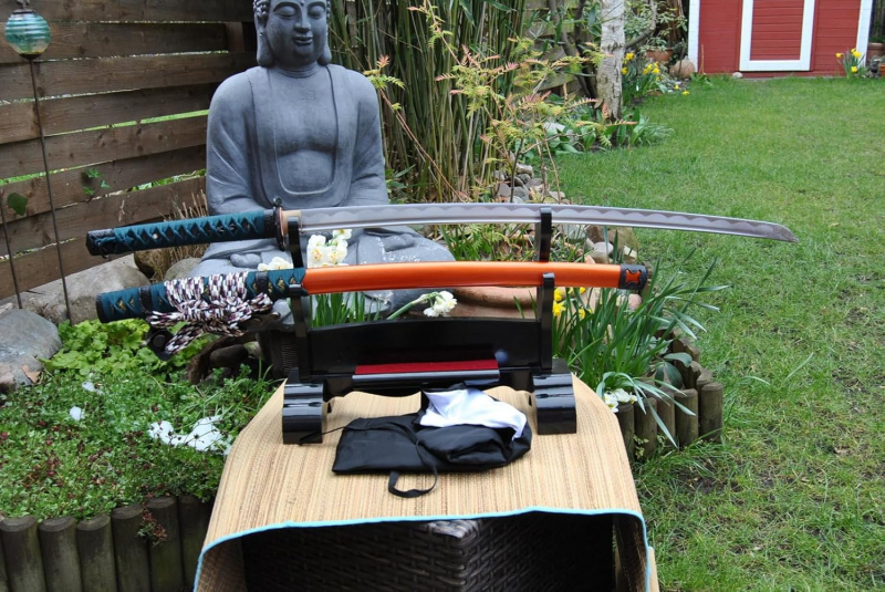 Wunderschöne Handgeschmiedete Katana Samurai Schwert aus aller besten Stahl 1045 die durch das harmonische Zusammenspiel mit Saya und Tsuka zu einem vollkommenen Kunstwerk gemacht wurde. Das Schwert wird mit Schwertbeutel geliefert. Die gesamte Länge des Schwertes ist 104cm, die Klingenlänge 73cm und der Griff ist 28cm lang.Klingenbreite: 3,2 cm cm Klingenrücken: 8 mm Die Saya ist Schwarz lackiert. Die Zubehörteile haben ein Tanaka Samurai Design und sind aus Metall, der Habaki ist aus massiven Messing. Der Griff ist aus Holz und in Rochenhaut eingelegt.Dieses Schwert ist nicht nur ein Kunstwerk das in höchstem Maße dekorativ ist, sondern es ist auch scharf und vollkommen geeignet für echte Kämpfe und Schnittübungen. Die Klinge besitzt eine BO-HI.Die Klinge ist, zwecks Größerer Sicherheit, mit zwei mekugi (Bambus Zapfen) befestigt. .Ohne Ständer
