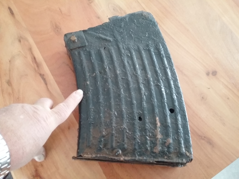 Hallo. Hier ein 20mm Flak Magazin. Fund. Defekt. Überlackiert. Zubringer unten fest. Maroder Zustand. Zeitzeuge. Frei von Gefahr und oder Gefahrstoffen..