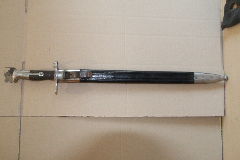 M1878 mit drei Nieten im Griff,Klinge gut ohne Kerben,Säge scharf,Griffschalen und Drücker gut,Scheide gut Naht geschlossen,Ort und Mundblech ohne Dellen,mit zugehörigen Koppelschuh im guten Zustand.