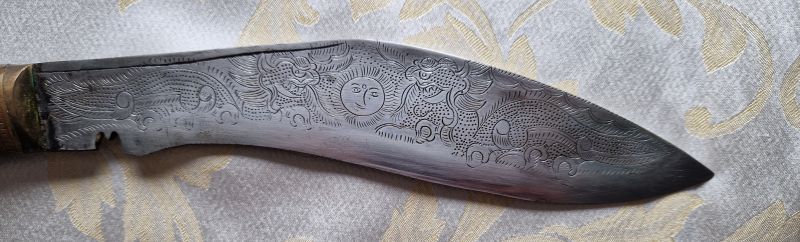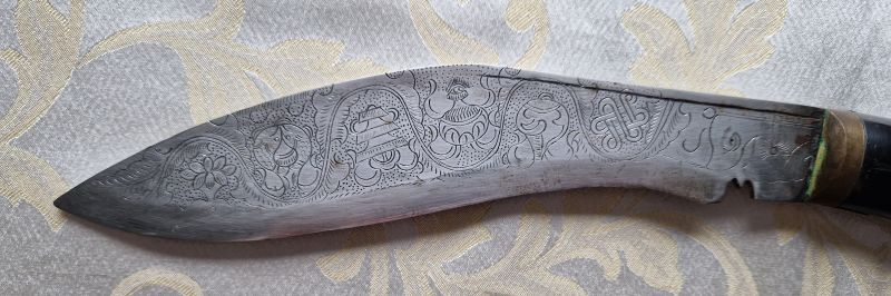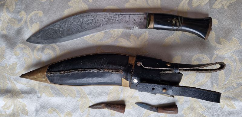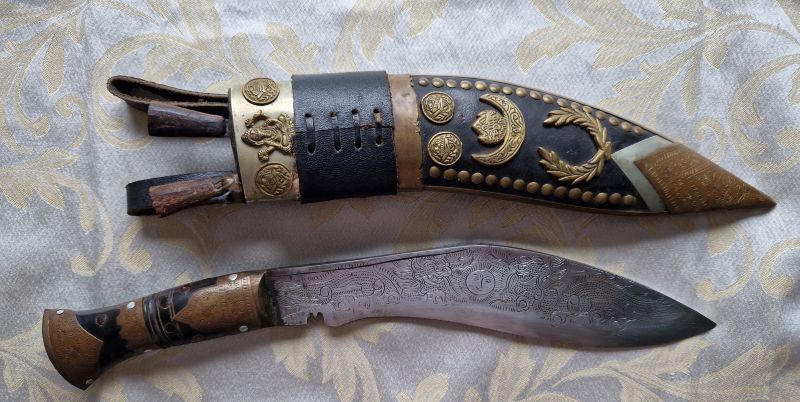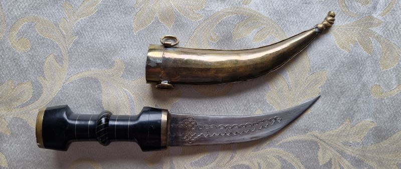 3. Verziertes Gurkamesser. Kuhhorngriff. Gesamtlänge mit Scheide 42 cm.