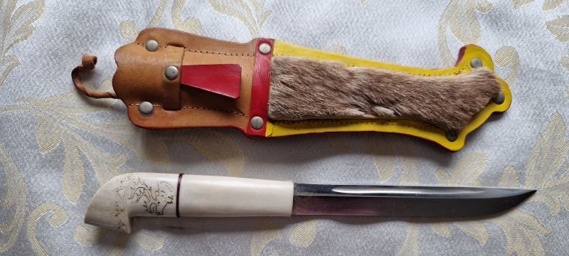 1. Finnenmesser mit Scheide. Knochengriff. Gesamtlänge mit Scheide 28 cm.