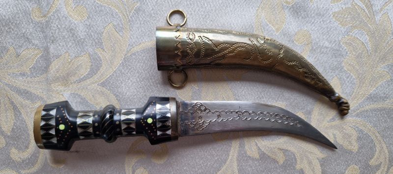 2. Verzierter Orientdolch mit Scheide. Kuhhorngriff. Gesamtlänge mit Scheide 28 cm.