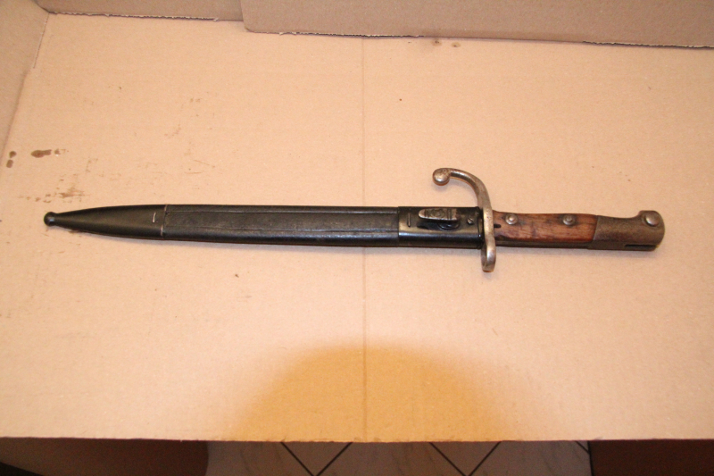 M1908 Hersteller:W.K.&CIE,Klinge mit Patina, im unteren Bereich leicht Feinporig ohne Kerben,Griff und Drücker gut,Scheide gut Naht geschlossen,mit schwarzen Ort und Mundblech aus Eisen,Koppelhaken FI gestempelt (FABRIICA ITAJUBA)